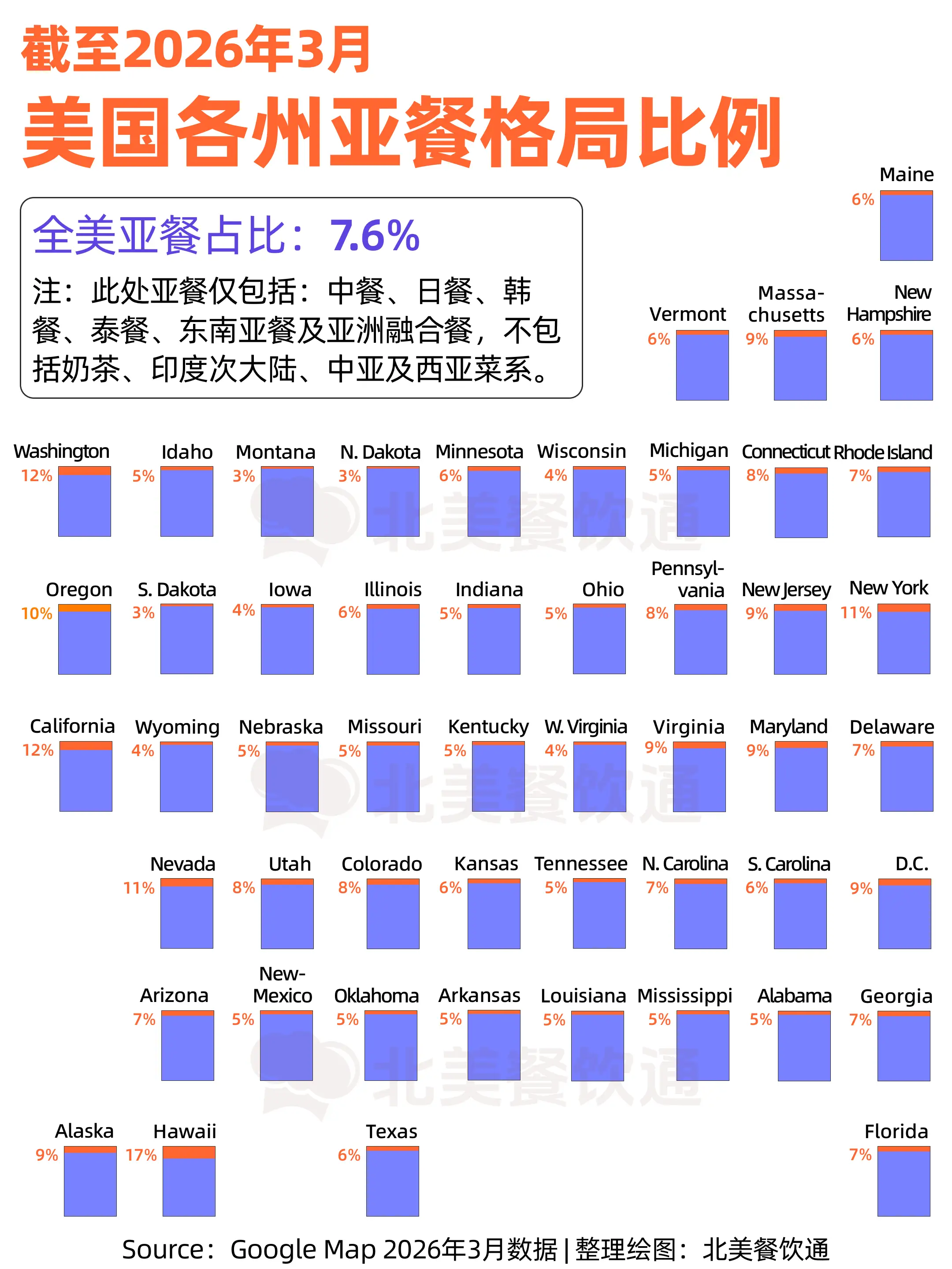 根据截至2026年3月的Google Map数据,美国亚餐在全国餐饮中的平均占比为 7.6%,多数州的亚餐占比在5%~6%区间。