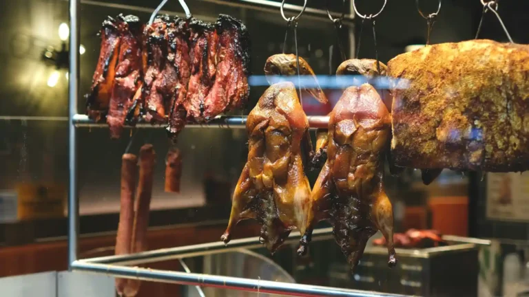 中餐烧腊店内展示的各种烤制肉类,包括挂着的烤鸭、烧肉和腊肠
